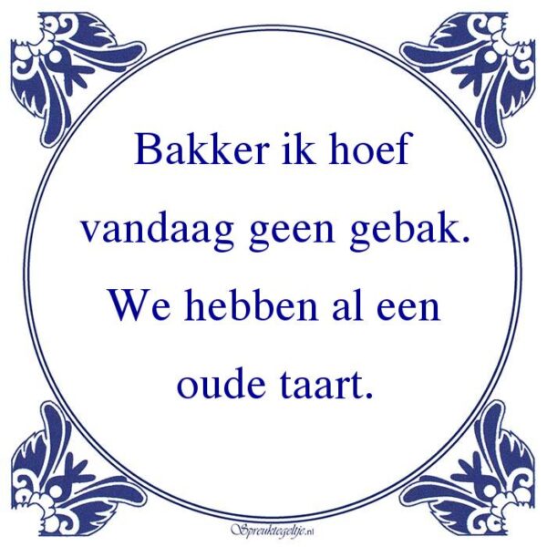 Bestel hier de spreuk: Bakker ik hoef vandaag geen gebak. We hebben al een oude taart.