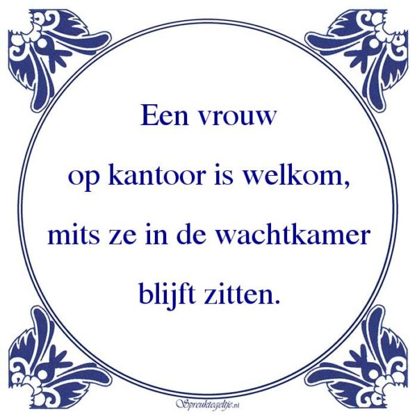 Bestel hier de spreuk: Een vrouw op kantoor is welkom, mits ze in de wachtkamer blijft zitten.