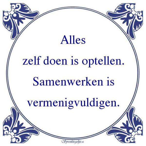 Bestel hier de spreuk: Alles zelf doen is optellen. Samenwerken is vermenigvuldigen.
